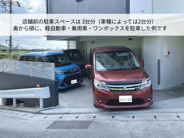 店舗前の駐車スペースは 3台分(車種によっては2台分) となっております。